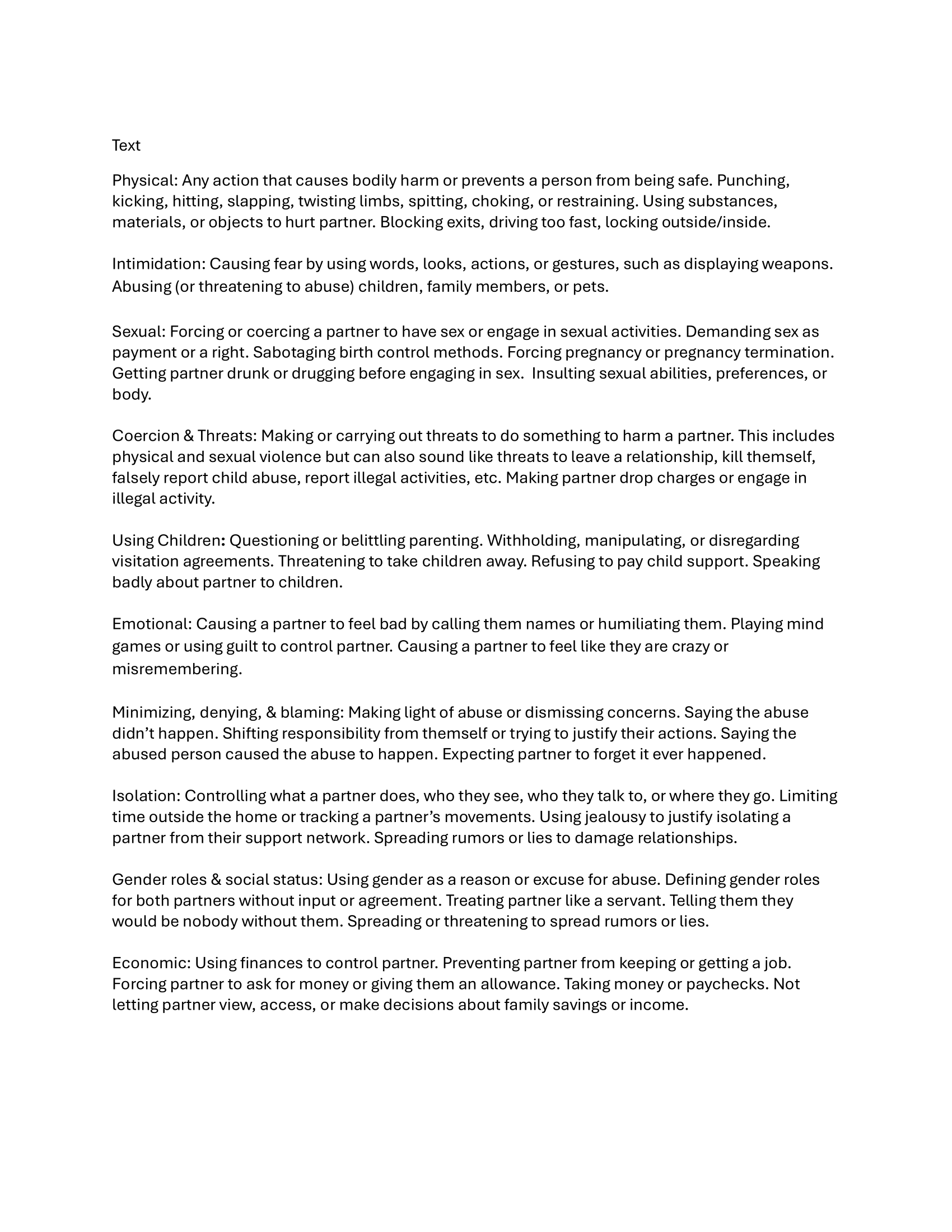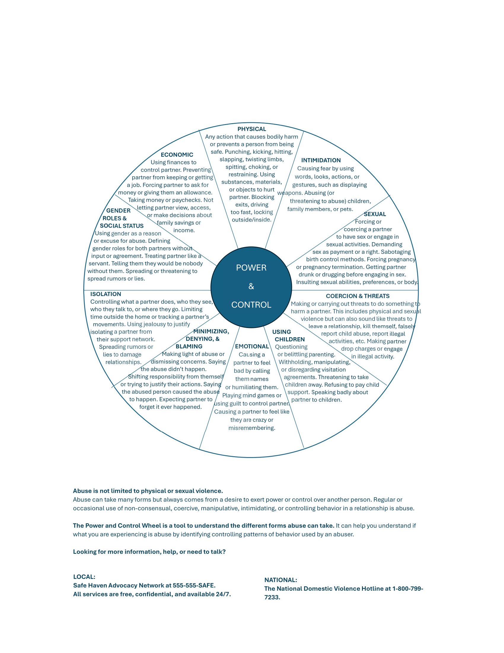 A wheel diagram is a common education tool used by those working in the field of interpersonal violence. It showcases how abuse and violence encompass more than just physical and sexual abuse. At many organizations supporting those who have been affected by domestic violence, this tool is a way to help clients identify and name their experiences while contextualizing those experiences as abuse. For this reason, the text is more dense than it might be on other graphics because the intent is to encompass as many experiences as possible to reach the most comprehensive number of people.