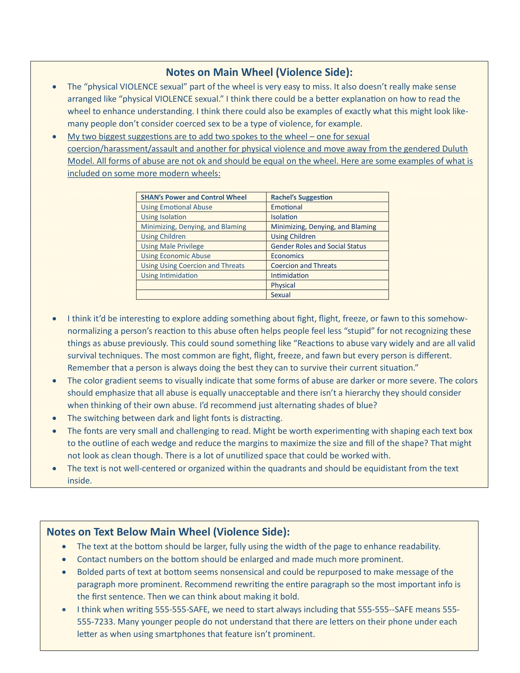 The immediate effectiveness of this document was seen with the people our client services team works with. As an education tool, it expanded the definition of power and control and allowed more individuals to understand and identify their experiences as serious, valid, and not their fault. It laid out in much more detail the types of abusive tactics used by those using power and control against others. Seeing their experience included on an “official” document was a decisive change in perspective for some and gave others something to consider.